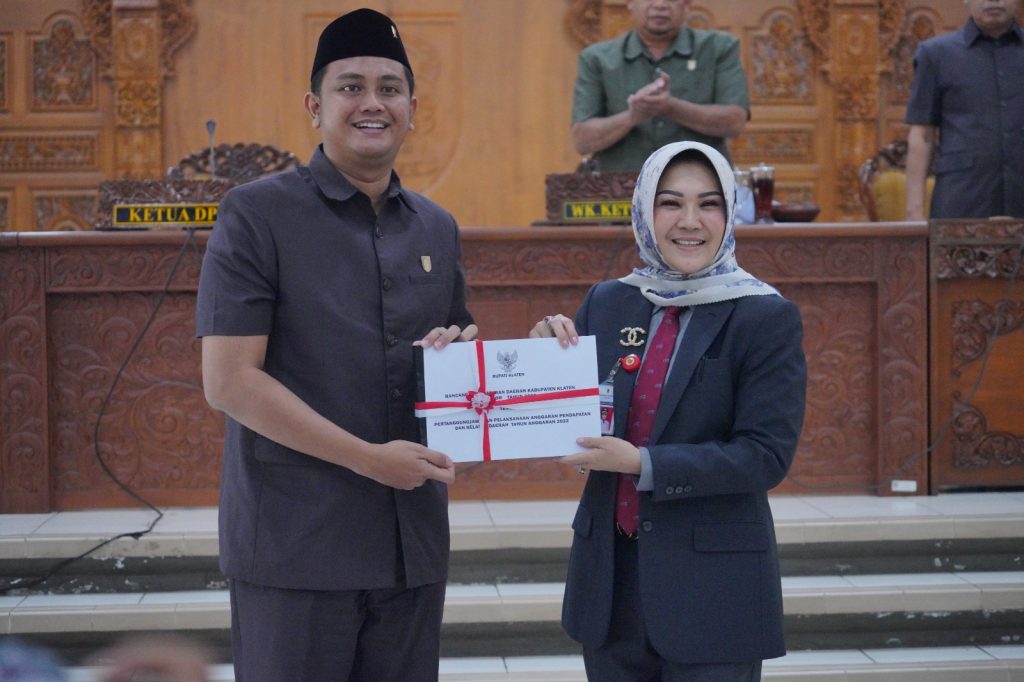 RILISJATENG.COM– Bupati Klaten, Sri Mulyani menyampaikan penjelasan Raperda Laporan Nota Keuangan Pertanggungjawaban pelaksanaan Anggaran Pendapatan dan Belanja Daerah (APBD) tahun anggaran 2022 pada rapat paripurna DPRD Klaten, Senin (22/5/2023).