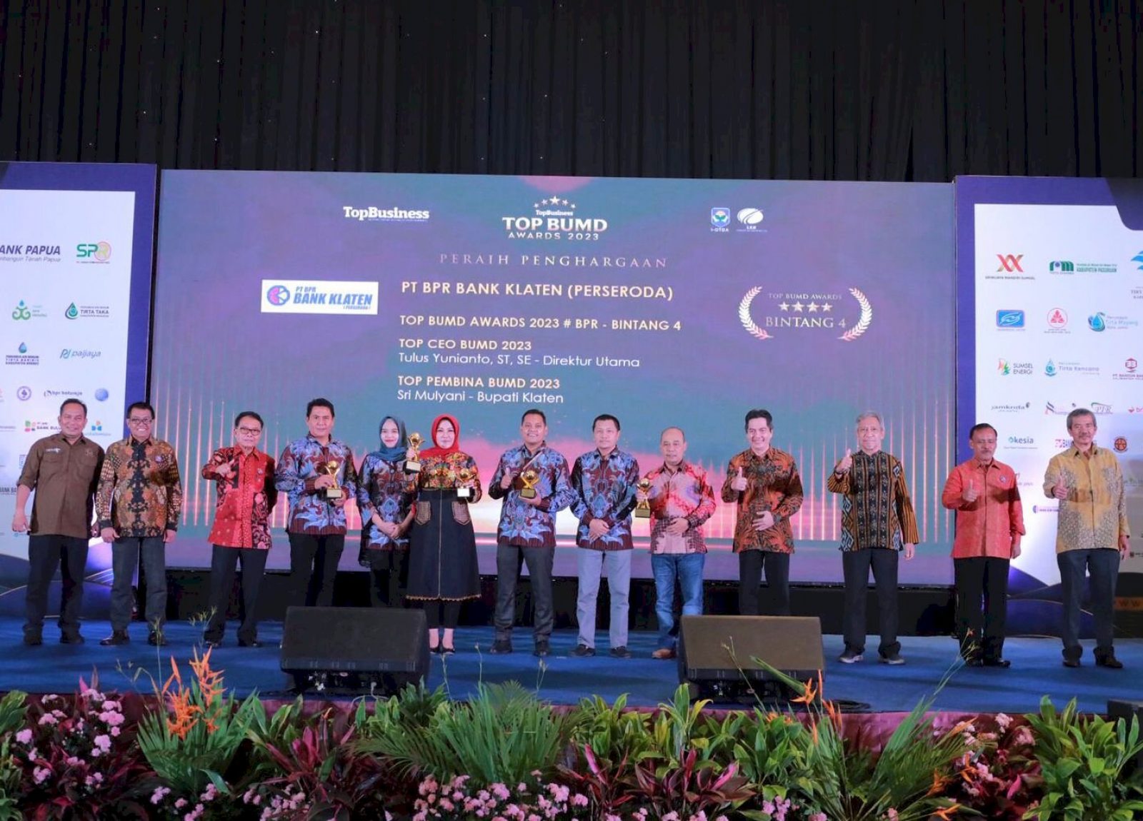 Dalam Kesempatan tersebut, Kabupaten Klaten kembali meraih lima penghargaan sekaligus antara lain Bupati Klaten, Sri Mulyani mendapat penghargaan TOP Pembina BUMD, PT BPR Bank Klaten (Perseroda) meraih penghargaan TOP BUMD Awards 2023 #Stars 4, Perumda Air Minum PDAM Tirta Merapi meraih TOP BUMD 2023 #Stars 5, Tulus Yunianto selaku Direktur Utama PT BPR Bank Klaten (Perseroda) meraih TOP CEO BUMD 2023, dan Irawan Margono, Direktur Utama Perumda Air Minum PDAM Tirta Merapi meraih TOP CEO BUMD 2023.