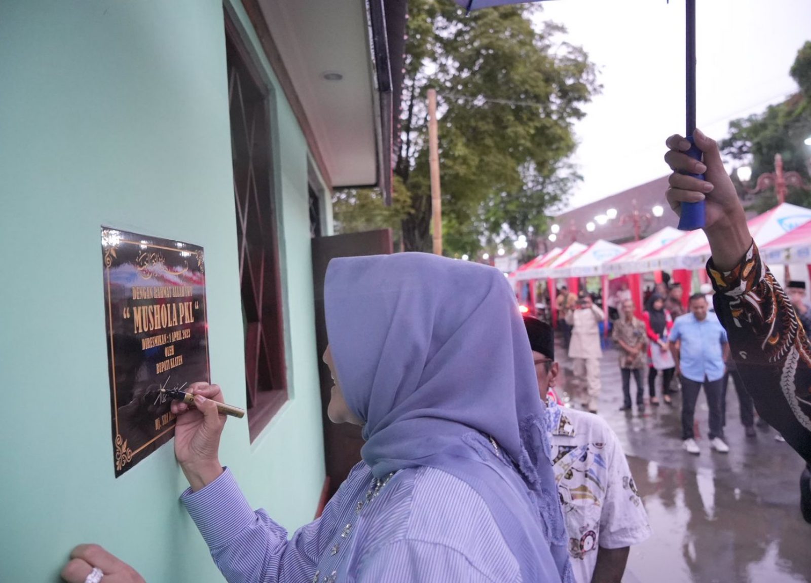 Terakhir, Bupati Klaten menandatangani prasasti Mushola PKL yang berukuran sekitar kurang lebih 4 meter x 4 meter tersebut.(RLS)