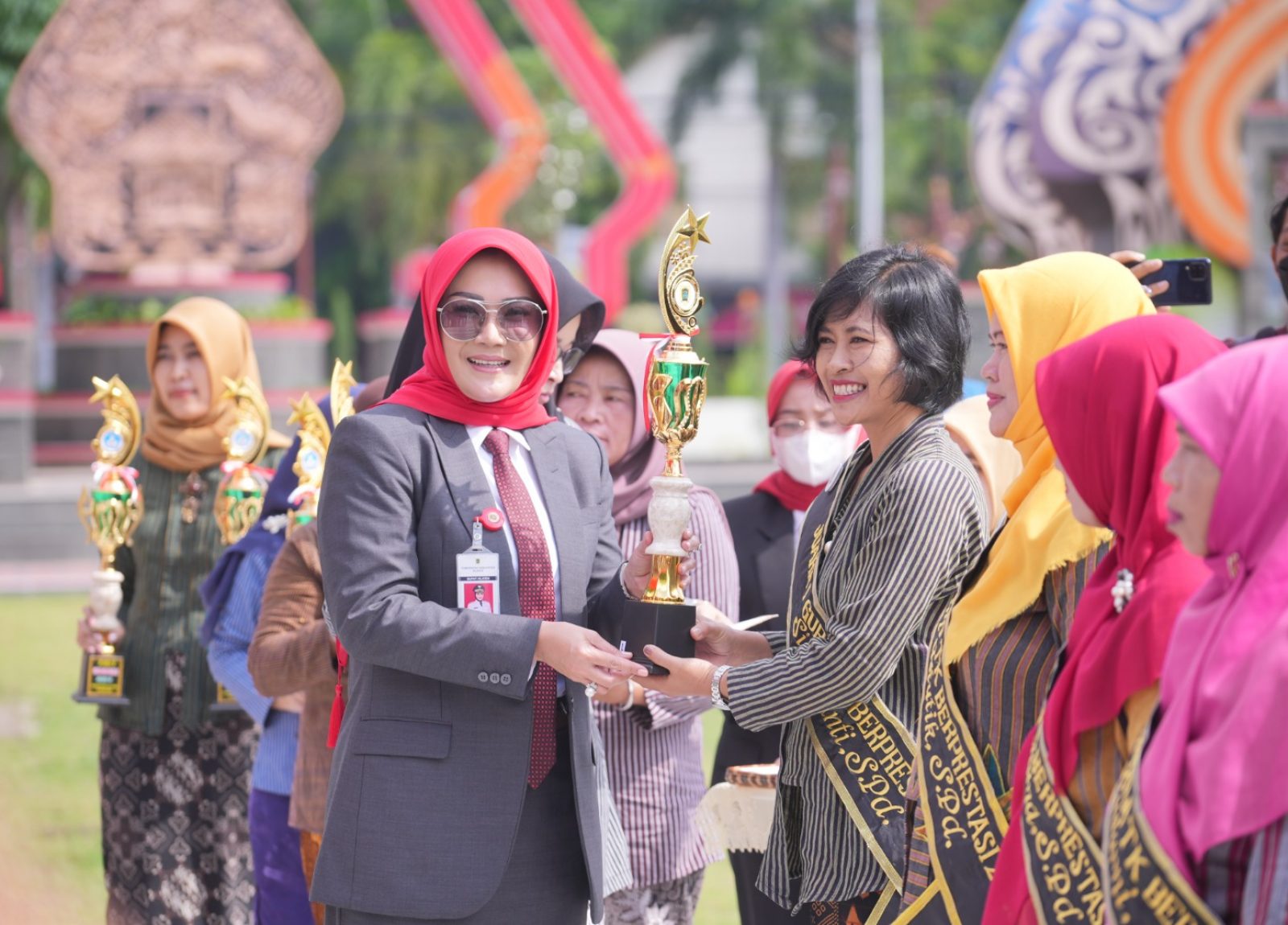 Terakhir, Sri Mulyani dan Forkopimda menyerahkan penghargaan kepada sembilan Guru dan sembilan Kepala Sekolah berprestasi se-Kabupaten Klaten.(RLS)