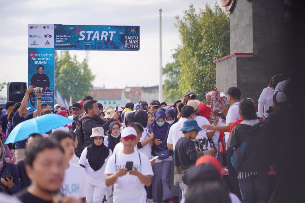 RILISJATENG.COM – Ribuan warga Klaten memadati Alun-alun Klaten, Sabtu (4/3/2023) pagi. Warga turut serta dalam jalan sehat yang digelar Kementerian BUMN.