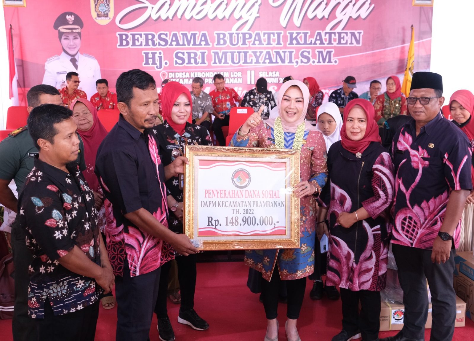 Selanjutnya, Sri Mulyani didampingi Camat Prambanan menyerahkan sejumlah bantuan kepada warga masyarakat seperti bantuan Baznas kepada dua penerima, dua unit bantuan jambanisasi, bantuan pendidikan kepada 10 anak SD senilai Rp. 400 ribu per anak, bantuan Dissosp3appkb kepada dua orang disabilitas, Bantuan simpel ayah dari Bank Klaten kepada 10 anak yatim, DAPM (Dana Amanah Pemberdayaan Masyarakat) Prambanan total Rp. 148 juta untuk 16 Desa di Kecamatan Prambanan, dan bantuan DBHCHT APBD II berupa pupuk NPK sejumlah 7000 kilo gram , POC 800 liter, dan ZA 4000 kilo gram.