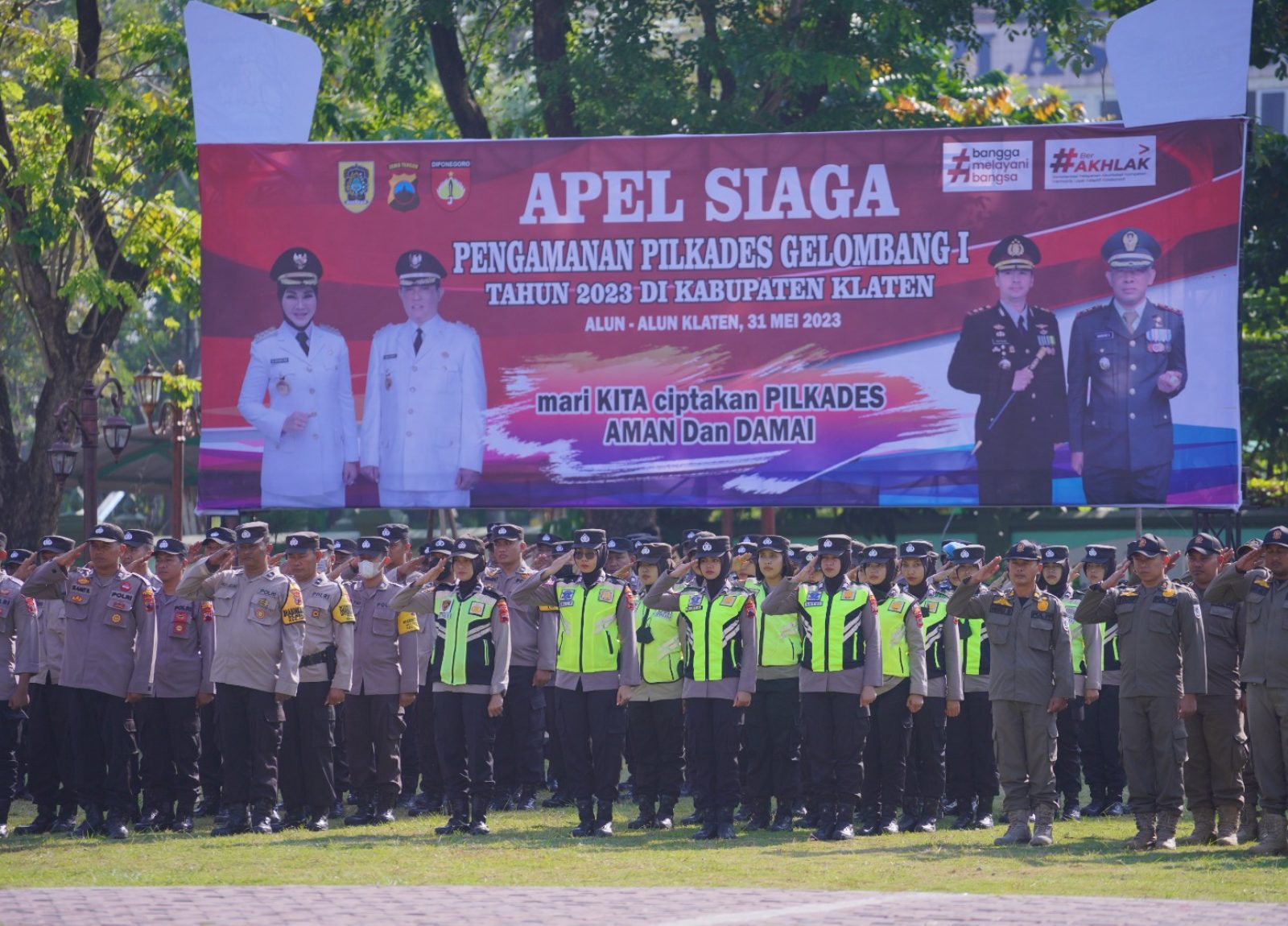 RILISJATENG.COM- Dalam rangka mewujudkan Pemilihan Kepala Desa (Pilkades) serentak Gelombang I yang akan digelar Rabu (05/07/23) mendatang, Pemerintah Kabupaten Klaten menggelar apel siaga pasukan pengamanan di Alun – Alun Klaten Rabu (31/05). Kegiatan diikuti Forkopimda, Sekretaris Daerah Kabupaten Klaten, para Asisten, Kepala OPD, TNI, Polri, Camat di 22 Kecamatan, Kepala Desa, Dinas Perhubunga, Satpol PP, Linmas, BPD dari 67 desa, Ketua Panitia Pilkades di 67 Desa, Ketua PMI, Ketua Organisasi Masyarakat, serta para tamu undangan.